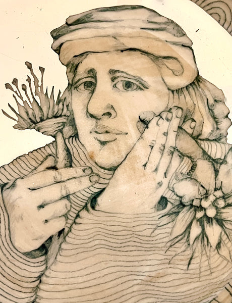 Condition: Vintage; Great w/ minimal signs of age, minor imperfections to glaze and minor to some signs of age around the rim of the plate, minor crazing in a few spots (photo #12). Plate features a high gloss silver glaze with a portrait of a male holding two flowers. Dated "1976" on the front of the plate in the lower rim. The Artists Signature is in plate "Pot by Edward Higgins" and "Drawings by Mary Lou Higgins" also Engraved with "Higgins" on the lip of the reverse. The bottom of the plate is marked with the number "5 101" written on a piece of paper tape. Photographs are taken in both natural & studio light & may appear slightly lighter or darker.